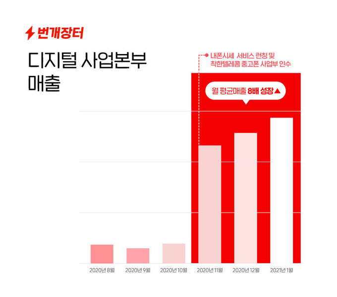 인수를 통해 번개장터는 정확한 중고폰 시세 데이터를 비롯해 렌탈 계약 형태의 고품질 물량, 검수 노하우, MVNO(알뜰폰 사업자)와의 협력 모델 등 착한텔레콤이 그동안 구축해온 운영 역량을 확보하게 됐다. 착한텔레콤 중고폰 사업 부문 인수 이후 번개장터의 ‘디지털 사업본부’ 매출은 인수 전후 각 3개월 평균 비교 시 8배 이상 증가했으며, 번개장터에서 유통되는 중고폰 수량도 동기간 3배 이상 늘어났다.