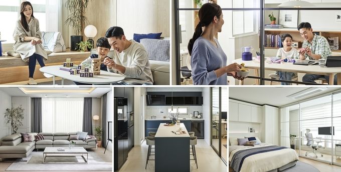 ‘초등 자녀가 있는 집 99㎡’은 부모의 재택근무와 아이의 온라인 수업을 위한 각각의 독립 공간들과 가족이 함께 취미를 공유하는 거실이 공존한다. 스마트폰 GPS를 활용해 가족이 집에 도착하기 전 환기시스템을 작동하거나 침대 온열패드를 작동시키는 홈 IoT 기술도 돋보인다.