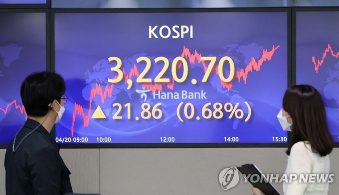 이날 코스피는 전 거래일보다 21.86포인트(+0.68%) 오른 3220.70에 거래를 마쳤다. 코스피 지수가 3200선을 넘긴 것은 지난 1월 25일(3208.99)이후 석 달 만이다. 코스피는 전날보다 소폭 하락 출발했지만 곧바로 상승 전환에 성공한 뒤 강세 흐름을 이어갔다. 장중 한때 3220.82까지 터치했다. 시가총액도 역대 최대치인 2246조원을 기록했다.