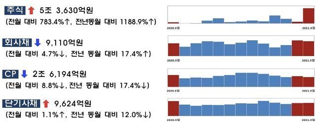 26일 금융감독원이 발표한 ‘2021년 3월 중 기업의 직접금융 조달실적’에 따르면 지난달 주식 발행은 총 16건·6조476억원으로 전월과 비교해 4건·5조3630억원(783.4%) 증가했다. 유상증자는 총 5건·4조8133억원으로 전월 대비 1건·821.7% 늘었다. 올해 1분기 최대어였던 SK바이오사이언스의 기업공개(IPO)와 대한항공 및 한화솔루션 등 코스피 시장에 상장된 대기업의 유상증자가 원인인 것으로 풀이된다.