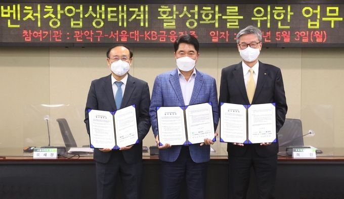 [FETV=박신진 기자] KB금융그룹은 지난 3일 서울 관악구, 서울대와 우수 창업기업 발굴 및 육성을 위한 상호협력을 주요 내용으로 ‘관악구 벤처·창업 생태계 활성화를 위한 업무협약’을 체결했다고 4일 밝혔다.