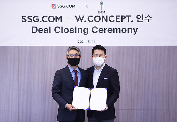 SSG닷컴은 지난 11일 ‘딜 클로징’을 열고 W컨셉 지분 100% 매매대금 지급을 완료했다고 12일 밝혔다. 이날 행사에는 강희석 SSG닷컴 대표이사, 송인준 IMM프라이빗에쿼티 사장이 참석했다.