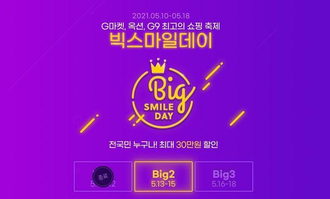 빅스마일데이 2차 쿠폰은 15일까지 사용 가능하며, G마켓과 옥션, G9에서 각각 제공된다. 전체 회원 대상 최대 30만원, 최대 3만원, 최대 1만원이 할인되는 ‘20% 할인쿠폰’ 3종으로, 스마일클럽 회원에게는 해당 쿠폰을 한 장씩 더 제공한다.