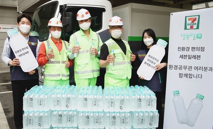 세븐일레븐은 전국 6개 지역 지자체(서울 중구, 성남 중원구, 대전 동구 등) 소속 환경미화원 약 600명에게 무라벨 PB생수 ‘얼쑤얼水 500ml’ 총 1만4천개를 내달 4일까지 순차적으로 전달한다고 27일 밝혔다.