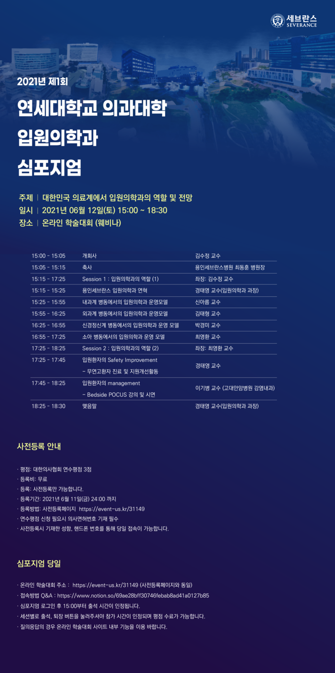 이번 심포지엄에는 용인세브란스병원 최동훈 병원장을 비롯해 경태영 입원의학과장, 김수정 교수 등 입원의학분야 전문 의료진이 참석한다. 입원의학과 심포지엄은 6월 11일까지 사전등록페이지에서 신청을 통해 참석할 수 있다.