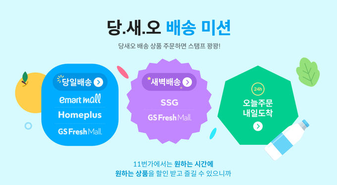 11번가 ‘오늘 장보기’ 전문관 내 ‘당일배송’(이마트몰, 홈플러스, GS프레시몰)과 ‘새벽배송’(SSG닷컴, GS프레시몰), 우체국과 협업한 ‘익일배송’(‘오늘주문 내일도착’) 중 필요한 배송 서비스로 3만원 이상 결제 후 구매확정 하면 주문 횟수에 따라 추첨해 경품을 증정한다.