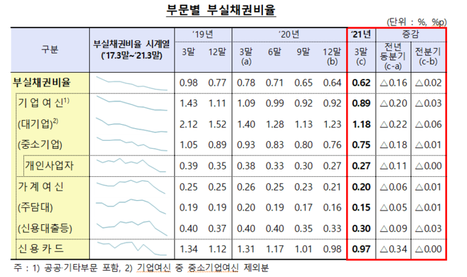 2일 금융감독원이 발표한 '국내은행의 부실채권 현황(잠정)'에 따르면 3월말 국내은행의 부실채권비율은 0.62%로 전분기 말(0.64%)보다 0.02%p 하락했다.