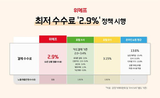 위메프가 도입한 2.9%의 수수료율에는 PG수수료까지 포함하는 것으로, 네이버, 카카오 등 플랫폼 사업자들과 비교해도 업계 최저치다. 네이버 스마트스토어 등 포털 기반 플랫폼 사업자는 매출 연동 수수료 외에 별도의 결제 수수료 등을 더해 5% 이상의 수수료를 적용한다. 위메프는 포털 방식의 최저 수수료 도입과 함께 기존 오픈마켓 사업자들의 상품별 차등 수수료 체계도 무너뜨렸다.