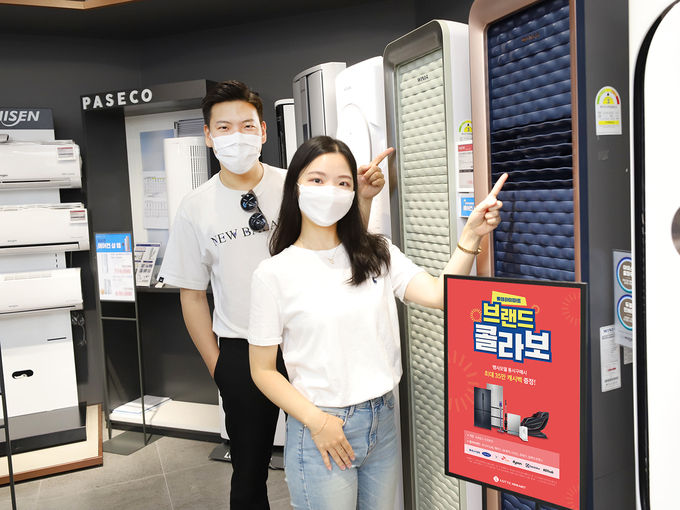 이번 ‘브랜드 콜라보’ 행사에는 위니아딤채, 캐리어, SK매직 등 6개 파트너사가 함께 한다. 행사상품은 대형가전 26개와 주방·생활가전 17개로 구성한다. 대형가전은 스탠드 에어컨, 800리터대 4도어 냉장고, 23kg 드럼세탁기 등을 포함한다.