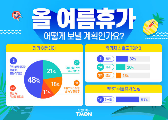 [FETV=김윤섭 기자] 티몬은 여름휴가 성수기를 앞두고 설문조사를 실시한 결과 10명 중 6명이 국내 여행을 계획하고 있으며, 숙박형태로는 독채형 펜션을 선호하고, 휴가기간은 3~4일간, 선호 지역은 강원, 제주, 경상도 순인 것으로 나타났다고 8일 밝혔다.