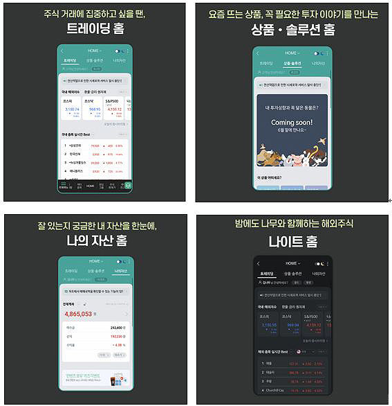 트레이딩에 집중하고 싶을 땐 ‘트레이딩 홈’을 사용할 수 있는데, 야간에는 해외주식에 최적화된 '나이트 홈'으로 자동 설정된다. 뜨는 상품과 꼭 필요한 투자 이야기가 궁금할 땐 ‘상품·솔루션 홈’을 이용할 수 있고, ‘나의 자산 홈’을 통해 자산 구성을 확인·관리한다.