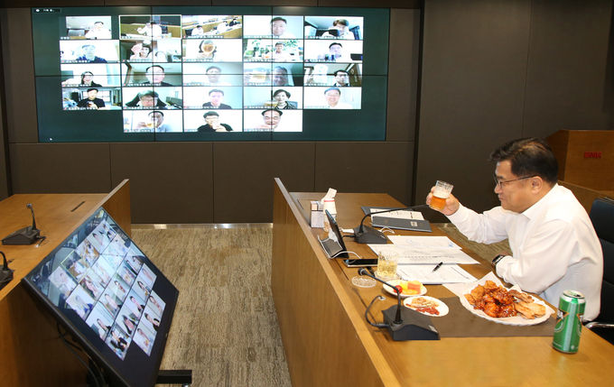 25일 금융권에 따르면 경남은행은 최근 랜선회식을 실시했다. 지난 21일 최홍영 경남은행장은 코로나19로 인해 직원들과 소통하지 못하는 상황속에서 영업현장의 지점장들을 격려하기 위해 줌(ZOOM)을 통한 온라인 ‘랜선회식’를 2시간 가량 진행했다. 랜선회식이란 온라인으로 진행하는 회식으로 코로나19의 영향으로 기업에서 새롭게 유행했다. 이날 20명의 지점장들은 편안한 복장 차림으로 자택 등 자유로운 장소에서 랜선회의에 참여했다.