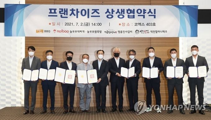 2일 산업통상자원부에 따르면 이날 오후 서울 강남구 코엑스에서 ㈜놀부-놀부부대찌개·놀부보쌈족발, ㈜명륜당-명륜진사갈비, ㈜역전에프앤씨-역전할머니맥주, ㈜제너시스비비큐-비비큐치킨 등 외식분야 4개 프랜차이즈 가맹본부와 가맹점 간 '프랜차이즈 상생 협약식'이 열렸다.