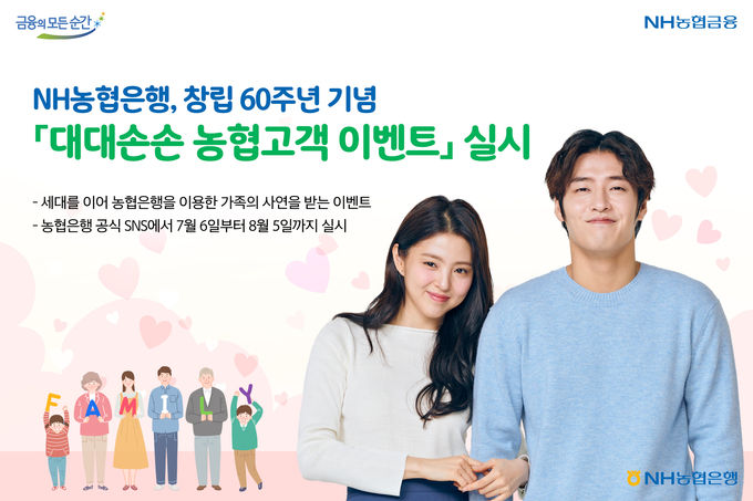 [FETV=권지현 기자] NH농협은행은 농협 창립 60주년을 기념해 세대를 이어 농협은행을 이용한 가족의 사연을 받는 ‘대대손손 농협 고객 이벤트’를 실시한다고 6일 밝혔다.
