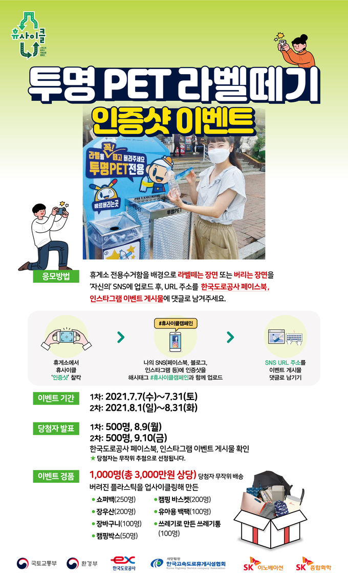 SK이노베이션 등 협의체는 ‘휴(休)-사이클’ 캠페인의 첫 활동으로 전국 고속도로 휴게소 이용객들을 대상으로 하는 ‘투명페트 라벨떼기 인증샷’ 캠페인을 개시한다. 캠페인 기간은 ▲(1차) 7월 7일부터 7월 31일, ▲(2차) 8월 1일부터 8월 31일까지다.