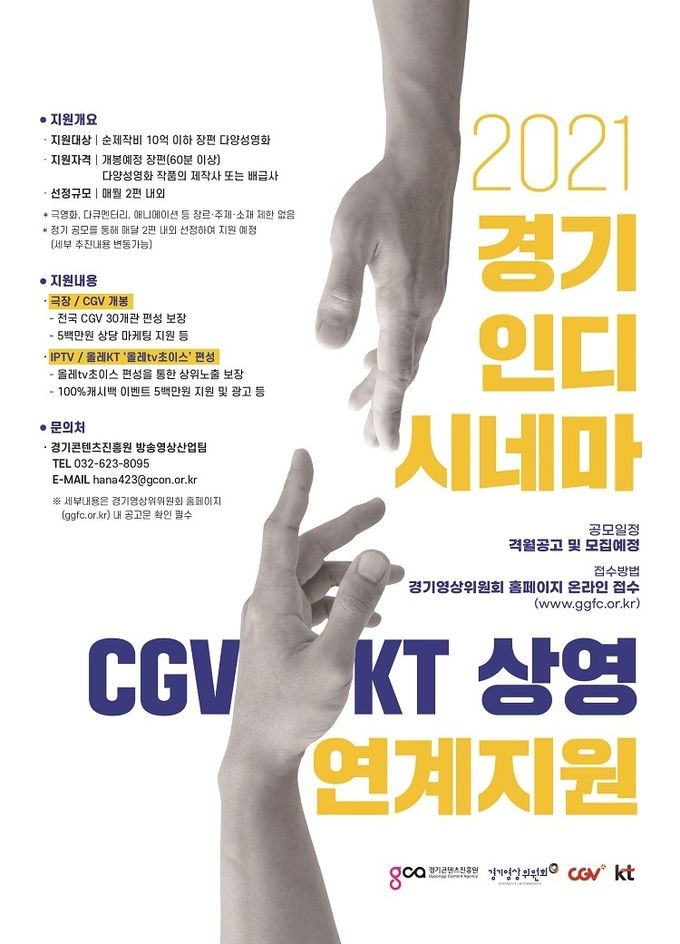 조진호 CGV 콘텐츠기획 담당은 “이번 ‘2021 경기인디시네마 CGV·KT 상영 연계지원’ 사업은 숨겨진 보석 같은 영화를 발굴해 관객들에게 소개하는 좋은 기회가 될 것”이라며 “CGV는 현재 운영 중인 아트하우스를 비롯해 이후에도 여러 사업을 통해 다양성 영화 지원을 지속하겠다”고 말했다.
