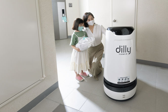 딜리타워는 각 세대 현관 앞으로 물품을 배달하는 자율주행형 실내 배달 로봇으로 사전에 입력된 이동경로에 따라 움직이며, 엘리베이터도 스스로 타고 내릴 수 있다.