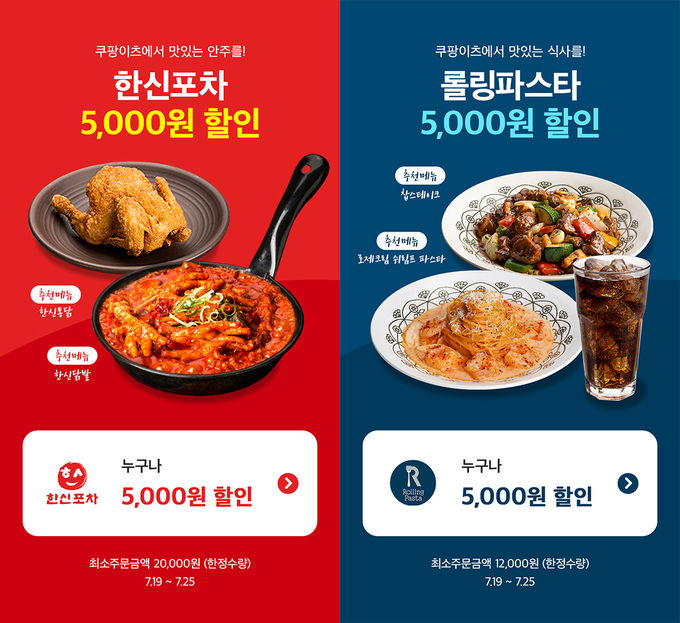 19일부터 25일까지 일주일간 진행되는 이번 프로모션은 쿠팡이츠 앱을 통해 한신포차와 롤링파스타의 메뉴를 최소 주문 금액 이상 배달 주문하면 5000원 할인이 적용된다.