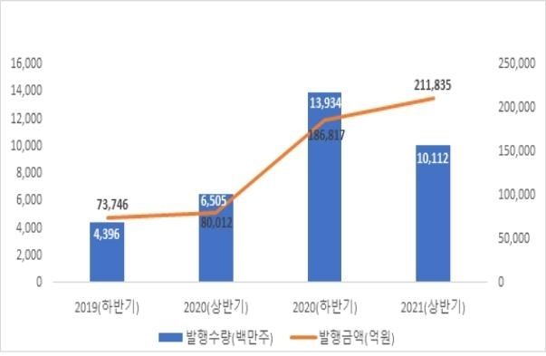 시장별 발행금액은 유가증권시장 14조4044억원, 코스닥 4조4690억원, 코넥스 984억원이다. 주식 발행 사유별로는 유상증자가 17조6035억원으로 가장 많았으며, 전환사채(CB)·신주인수권부사채(BW) 행사 3조3068억원, 스톡옵션 1932억원이 뒤를 이었다. 상반기 기업공개(IPO) 공모 발행금액 상위사는 SK바이오사이언스(9945억원)·SK아이이테크놀로지(8984억원)·솔루엠(1088억원) 등이다.