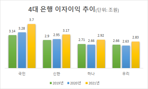 국민은행이 전년보다 12.9%(4125억원) 늘어난 3조6972억원으로 가장 많았으며, 신한은행이 7.3%(2157억원) 증가한 3조1662억원으로 뒤를 이었다. 같은 기간 하나은행과 우리은행은 1년 전보다 각각 9.5%(2534억원), 7.7%(2010억원) 증가한 2조9157억원, 2조8260억원을 거뒀다.