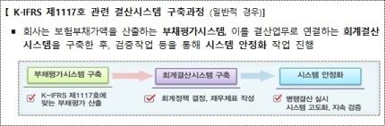 새로운 기준서 적용을 위해 보험사는 결산시스템 구축, 임직원 교육 등과 관련된 준비상황 및 향후 계획도 사전공시해야 한다. 또한 새 기준서 적용에 따른 재무적 영향을 단계적으로 알려야한다. 올해부턴 예비적 재무영향평가·회계기준 변경 영향을 받는 주요 계정 잔액 등을, 내년엔 구체적 재무영향평가·주요 계정별 재무수치 증감 등을 사전공시해야한다.