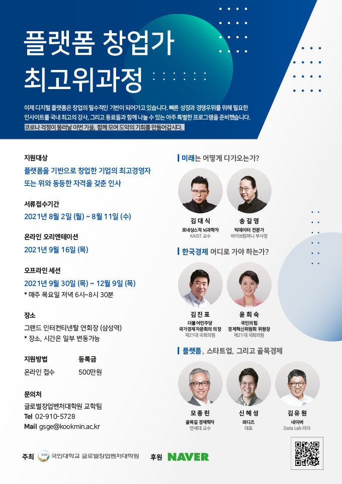 국민대학교 글로벌창업벤처대학원이 운영하고 네이버가 후원하는 '플랫폼 창업가 최고위과정'은 플랫폼 창업으로 시작해 기업을 이끌고 있는 최고경영자 및 임원 등을 대상으로 11일까지 참가자를 모집한다.