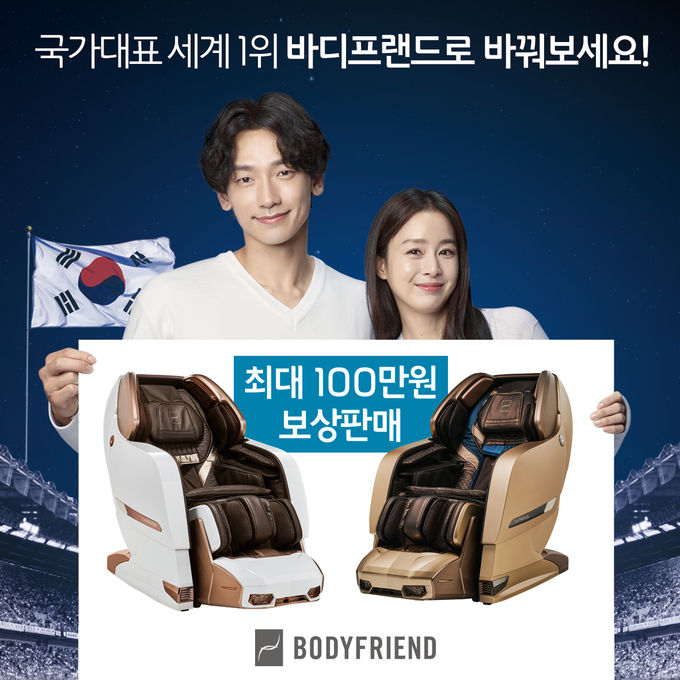 [FETV=김현호 기자] 바디프랜드가 사용 중인 제품을 반납하면 최대 100만원의 보상혜택을 제공하는 '국가대표 안마의자 보상판매'를 진행한다.