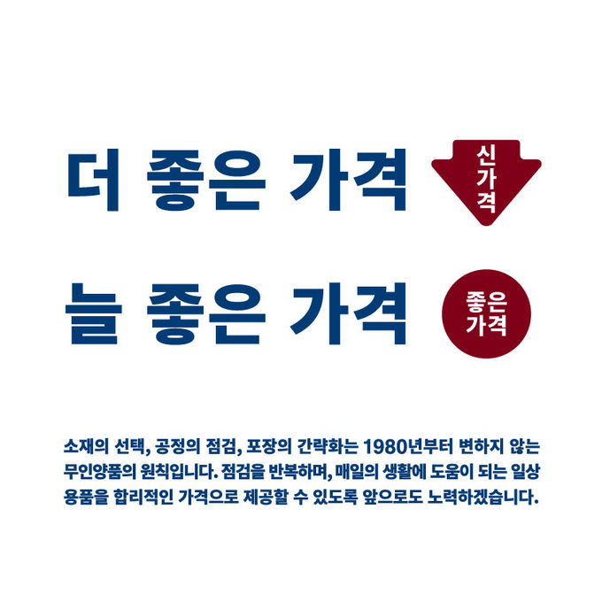 무인양품은 계속적으로 진행해 온 상품 가격 조정을 이번에 대대적으로 펼친다. 이는 생활에 꼭 필요한 의식주 제품을 보다 저렴한 가격에 제공하여 고객의 구매 부담을 덜고 건강하고 아름다운 삶을 향유하는 등 모든 고객의 생활에 도움을 주고자 마련됐다.