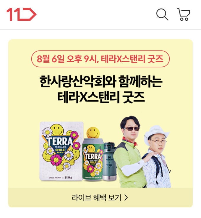 6일 오후 9시 11번가 ‘LIVE 11’에서 진행되는 방송에는 유튜브 채널 ‘피식대학’의 인기 콘텐츠 ‘한사랑 산악회’에서 활약 중인 배용길, 정광용이 출연, ‘테라 X 스탠리’ 콜라보 제품을 포함한 총 5종의 굿즈를 공개한다. 제품을 직접 사용해보면서 굿즈별 특징은 물론 일상 속 사용 꿀팁도 함께 소개할 예정이다.