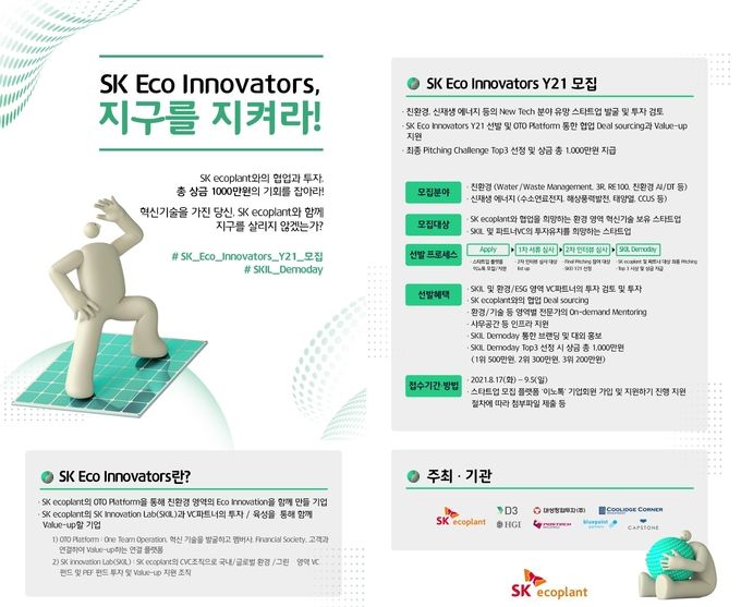 SK에코플랜트는 미래 친환경 유니콘 기업을 육성하기 위해 친환경 및 신재생에너지 분야의 스타트업을 모집하고 메타버스를 통한 가상현실에서 데모데이를 진행할 계획이다. 이번 행사는 환경 영역의 벤처캐피탈(VC)파트너가 공동으로 참여해 선정된 스타트업에게 기술개발 협력 및 투자도 진행한다. SK에코플랜트와 협업을 희망하거나 투자유치를 희망하는 스타트업은 누구나 지원이 가능하다.