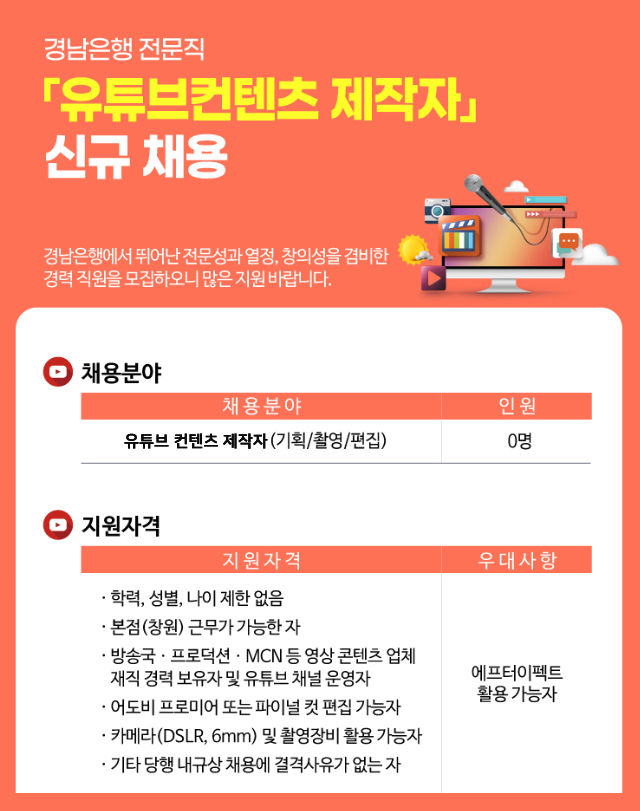 [FETV=박신진 기자] BNK경남은행은 경력직 유튜브 컨텐츠 제작자를 채용한다고 18일 밝혔다.