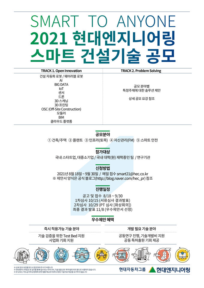 공모 대상은 국내 스타트업 및 대∙중소기업, 국내∙외 대학(원) 연구팀, 연구기관이며, 현대엔지니어링 공식블로그에서 양식을 다운받아 첨부 서류와 함께 메일로 신청하면 된다. 접수된 기술 제안은 개발 계획의 적정성, 기술의 우수성, 성과물의 활용성 등에 대해 내부 평가 후 최종 선정되며, 선정된 팀 및 기업에게는 기술 검증을 위한 Test bed 지원, 사업화 기회 지원, 공동연구 및 기술개발비 지원, 공동 특허출원 등의 특전이 제공된다.