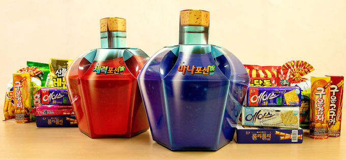 빨간색의 체력포션은 홈런볼, 맛동산, 에이스 등 인기제품 8종 구성. 체력회복에 도움을 주는 레몬과즙이 들어간 '신쫄이 레몬캔디'와 빨간패키지의 '딸기웨하스'로 체력포션 효능에 걸맞은 깨알 재미도 채웠다.