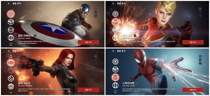 ‘마퓨레’에는 마블 세계관 속 슈퍼 히어로 8명이 등장한다. 캡틴 아메리카, 캡틴 마블, 스파이더맨, 블랙 위도우, 아이언맨, 닥터 스트레인지, 스타 로드, 스톰 등이다. 넷마블은 향후 업데이트를 통해 더 많은 슈퍼 히어로들을 선보일 예정이다.