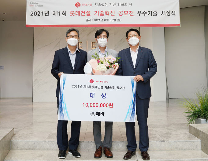 대상을 수상한 이훈 ㈜에바 대표는 “스타트업 기업은 대기업에 기술을 소개하는 진입장벽이 매우 높아 기회가 없는데, 이번 공모전을 통해 당사 기술을 알리고 적용할 수 있게 되어 매우 감사하다.”며 “롯데건설의 적극적인 기술혁신의 발걸음에 맞춰 당사도 최선을 다하겠다”고 수상소감을 밝혔다.
