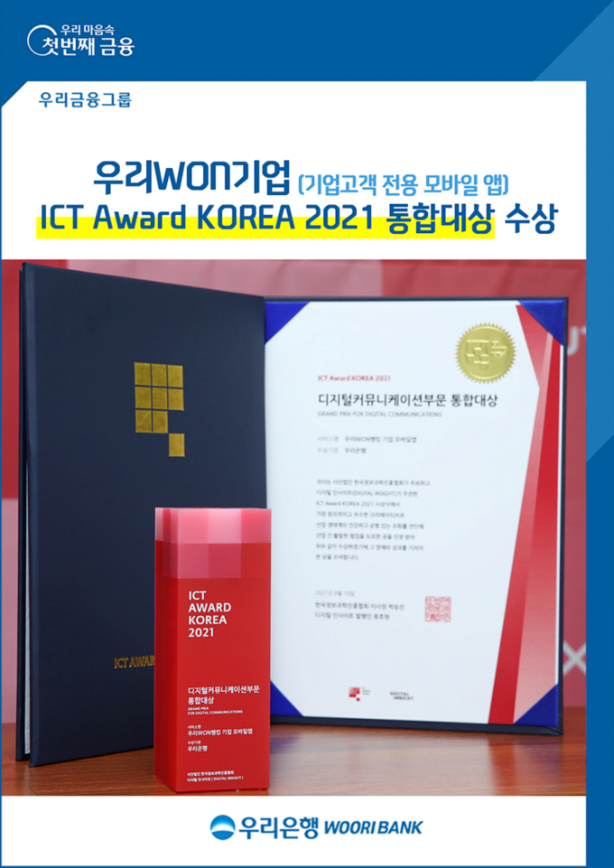 [FETV=권지현 기자] 우리은행은 기업고객 전용 모바일 앱인 ‘우리WON기업’이 한국정보과학진흥회가 주최하고 IT전문매거진 디지털 인사이트가 주관한 ICT 어워드 코리아(Award KOREA) 2021에서 커뮤니케이션 분야 통합대상인 ‘과학기술정보통신부 장관상’을 수상했다고 13일 밝혔다.
