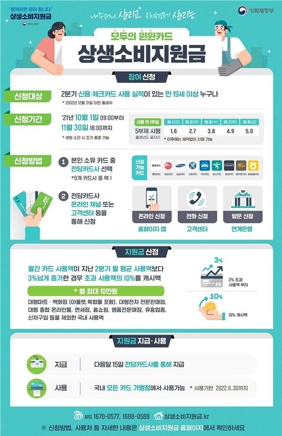카드 캐시백 지원을 원하는 사람은 9개 카드사 중 하나를 전담카드사로 지정해 신청하면 된다. 10월 1일부터 첫 1주일간은 출생연도 뒷자리에 연동해 5부제로(1·6년생 1일, 2·7년생 5일, 3·8년생 6일, 4·9년생 7일, 5·0년생 8일) 운영하고 이후는 출생연도에 관계없이 사업기간 전체에 걸쳐 신청할 수 있다.