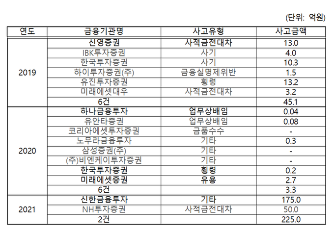 지난 2월 신한금융투자에서 해외비상장주식신탁과 관련해 발생한 175억원에 이르는 대형 금융사고가 포함된 것이다. 2016년 이래 100억원이 넘는 금융사고가 발생한 것은 처음이다. NH투자증권은 지난 2017년 30억원 규모 유용한 데 이어 올해 50억원 규모 사적금전대차 금융사고 논란을 일으켰다.