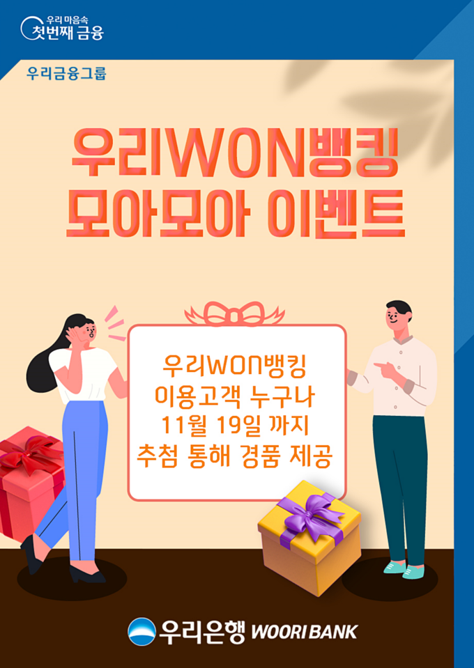 [FETV=권지현 기자] 우리은행은 우리원(WON)뱅킹 이용 고객에게 감사의 마음을 담아 풍성한 경품을 제공하는 ‘모아모아 이벤트’를 다음 달 19일까지 실시한다고 7일 밝혔다.