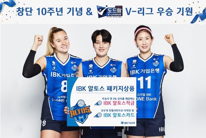 [FETV=박신진 기자] IBK기업은행은 오는 15일 알토스배구단 창단 10주년을 기념하고 도드람 2021~2022 V-리그 우승을 기원하는 패키지상품으로 ‘IBK 알토스적금’, ‘IBK 알토스카드’를 출시한다고 14일 밝혔다.