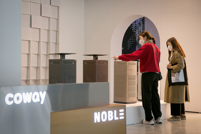 이번 전시에 소개되는 노블 공기청정기는 코웨이만의 혁신적인 에어테크놀로지를 접목해 강력한 4면 입체청정과 에어클린항균필터 시스템으로 집안 공기를 깨끗하게 케어 한다. 건축물에서 영감을 얻은 프리미엄 아키텍처 디자인은 공간을 세련된 분위기를 연출해준다.