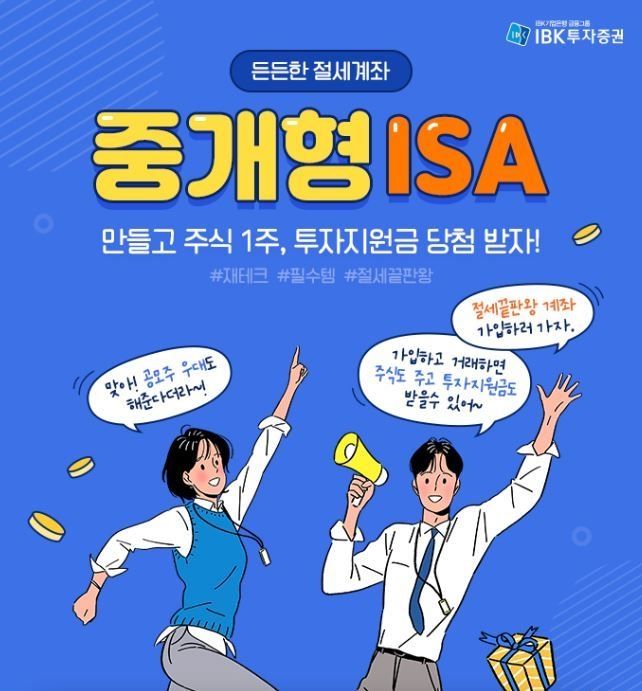 IBK투자증권 관계자는 “직접 투자를 선호하는 고객을 위해 세제 혜택까지 누릴 수 있는 중개형 ISA 계좌를 출시하게 됐다”며 “2023년부터 도입되는 주식 양도차익 과세에 대비하고, 목돈 마련과 노후자금 운용 등 재테크가 필요한 고객이라면 중개형 ISA를 개설하고 다양한 경품 혜택도 받으시길 바란다”고 말했다.