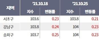 '강남불패' 신화로 대변되던 강남3구(강남구, 서초구, 송파구)의 상황도 다르지 않다. 지난 10월 25일 기준 강남구의 아파트 가격 상승률은 0.23%로 전주 아파트 가격 상승률(0.24%) 보다 0.01%p 떨어졌다. 서초구와 송파구는 각각 0.02% 하락한 0.21%, 0.23%를 기록했다.