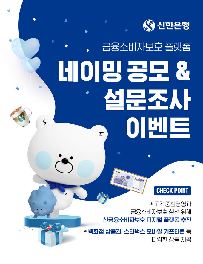 이번 행사는 플랫폼 명칭 및 고객 아이디어 응모와 금융소비자보호를 위한 고객 의견청취 두 가지 설문 영역으로 나눠 이달 12일까지 진행된다. 신한 쏠(SOL)과 인터넷뱅킹을 통해 누구나 참여 가능하다. 플랫폼 명칭 및 아이디어 우수 고객 5명에게는 백화점 상품권을, 고객의견청취 참여고객에게는 추첨을 통해 스타벅스 모바일 기프티콘을 각각 제공한다.