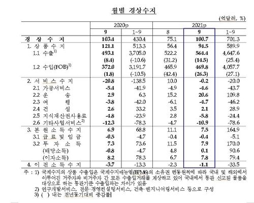 5일 한국은행이 발표한 '2021년 9월 국제수지(잠정)'에 따르면 지난 9월 경상수지는 100억7000만달러(약 11조9380억원) 흑자를 기록했다. 1년 전(103억4000만달러)과 비교해 2억7000만달러 줄어든 규모다. 하지만 작년 5월 이후 17개월 연속 흑자세르 유지했다.