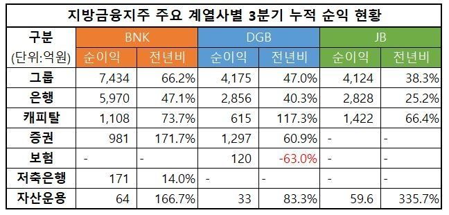 지방금융 별로는 BNK금융이 3분기 누적 순익 7434억원을 기록하며 전년 동기 대비 66.2% 증가했다. 부산·경남은행은 1년 전보다 순익이 평균 47.1% 늘어나 5970억원을 시현했다. 비은행 계열사 중에서는 증권 계열사가 981억원의 순익을 기록하며 전년 대비 171.1% 증가폭으로 가장 크게 성장했다. 이어 자산운용이 64억원을 거두면서 166.7% 순익이 대폭 늘었다. 캐피탈은 73.7% 성장하며 은행 다음으로 많은 순익인 1108억원을 기록했다.
