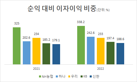 농협금융은 올 상반기 순익 1조3505억원(농업지원사업비 제외)을 기록, 순익 대비 이자이익 비중 338.2%를 나타냈다. KB금융과 신한금융은 각각 197.4%, 188.6%를 기록했으며, 하나금융(242.6%)과 우리금융(233%)도 300%를 밑돌았다. 농협금융은 작년 상반기에도 순익 대비 이자이익 비중이 나홀로 300%대를 기록하며 가장 높았다.